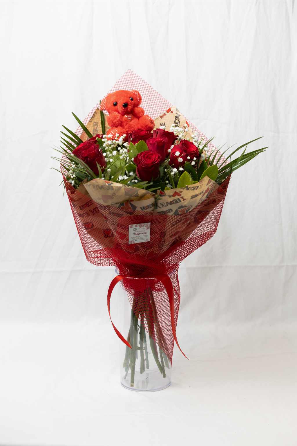 Μπουκέτο από 10 κόκκινα τριαντάφυλλα και μικρό λούτρινο αρκουδάκι!