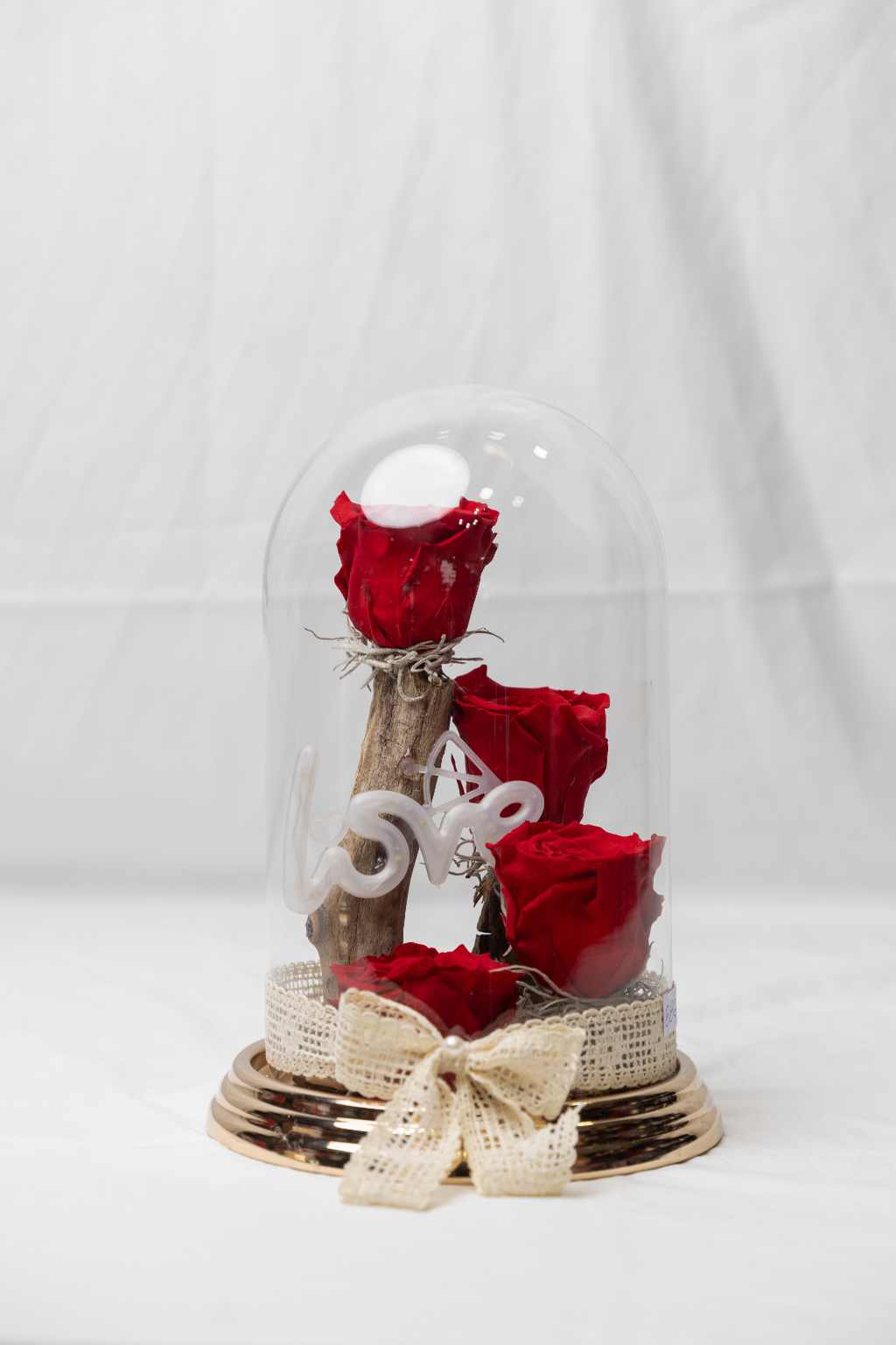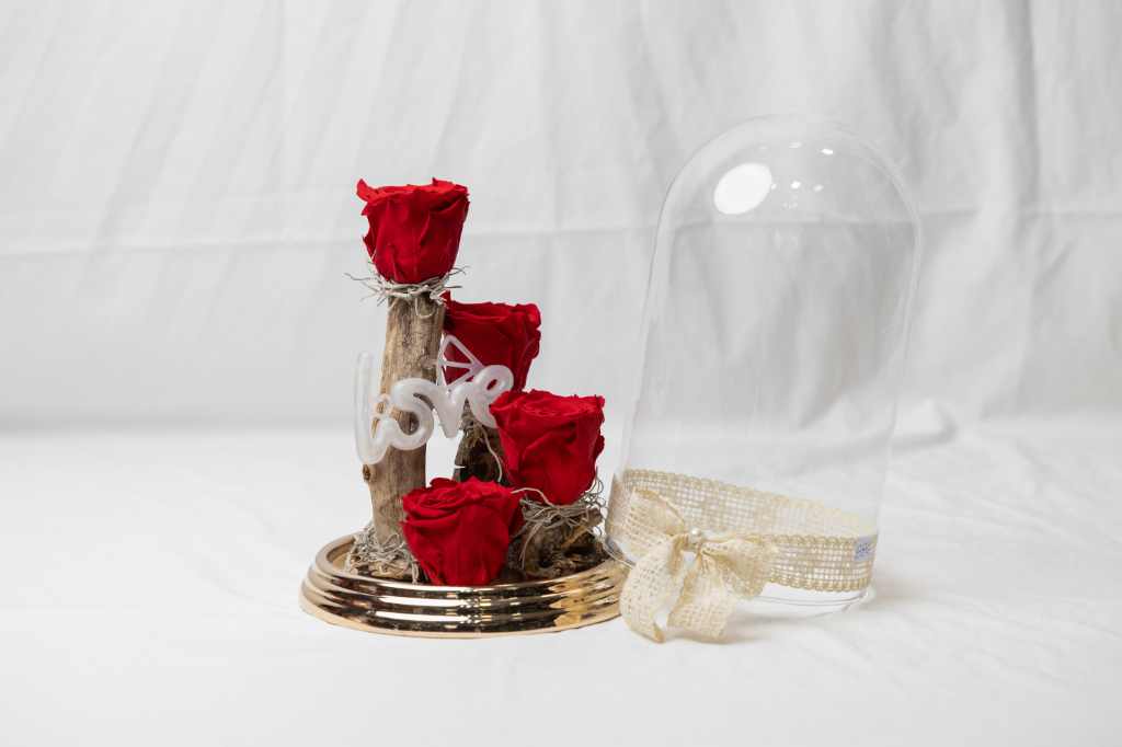 Γυάλα καμπάνα με τέσσερα αποχυμωμένα τριαντάφυλλα!Διαστάσεις γυάλας 26×15 cm