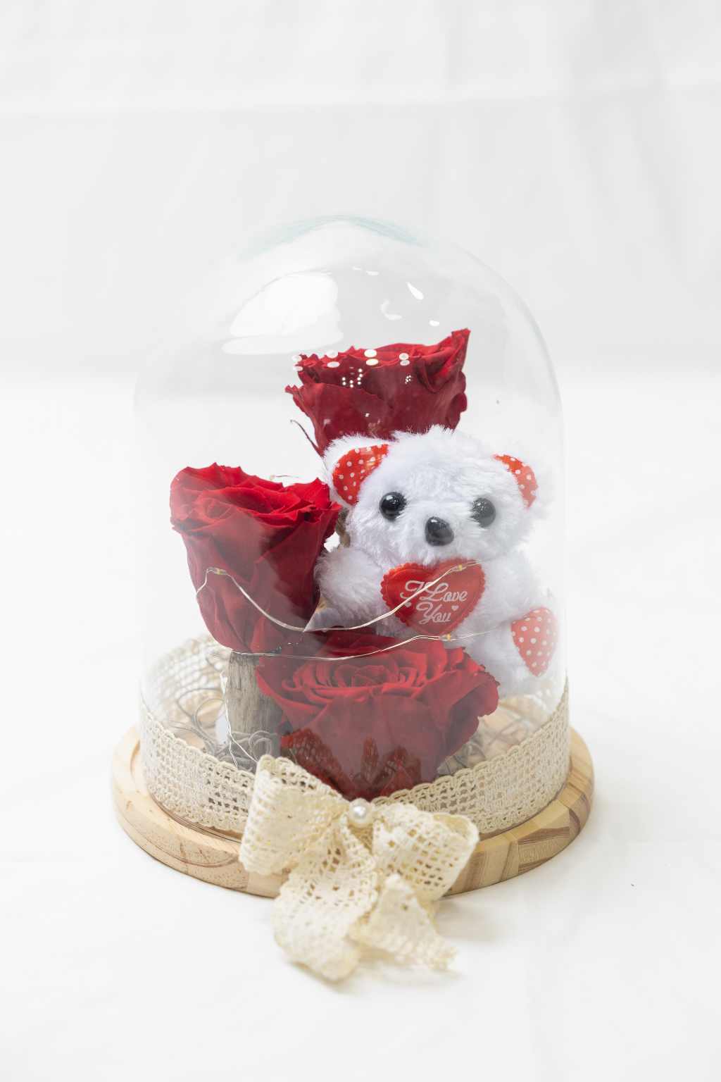 Γυάλα καμπάνα με αποχυμωμένα τριαντάφυλλα , αρκουδάκι και φωτισμό!Διαστάσεις γυάλας 22×16 cm