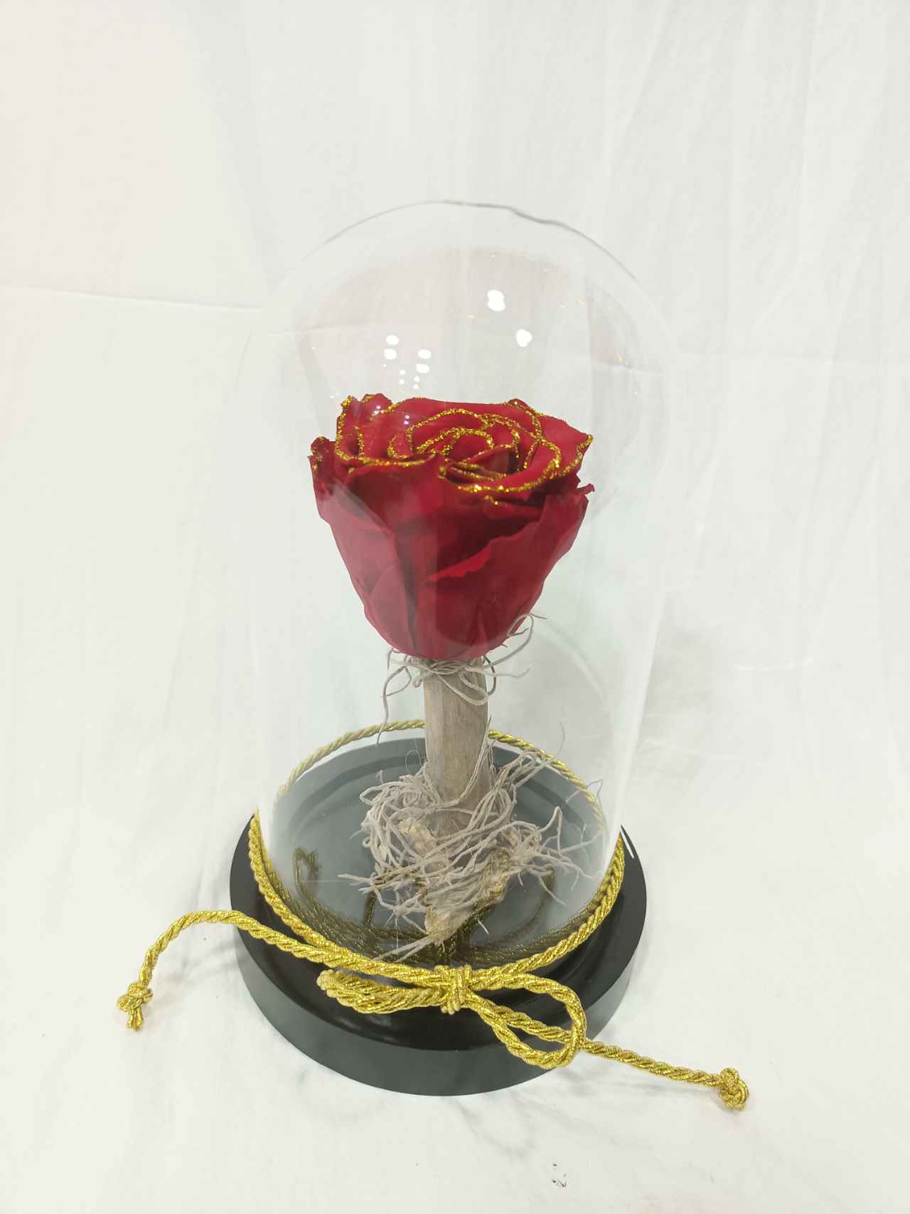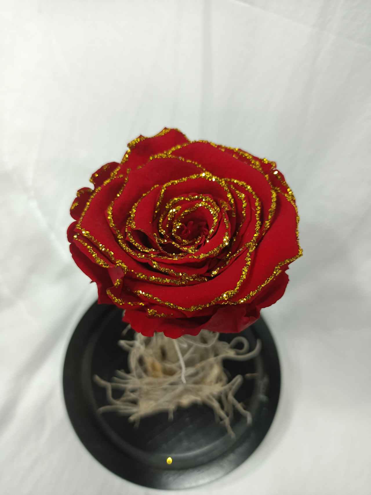 Κόκκινο αποχυμωμένο τριαντάφυλλο με χρυσό γκλίτερ σε γυάλα καμπάνα.Διαστάσεις γυάλας 18×10 εκατοστά