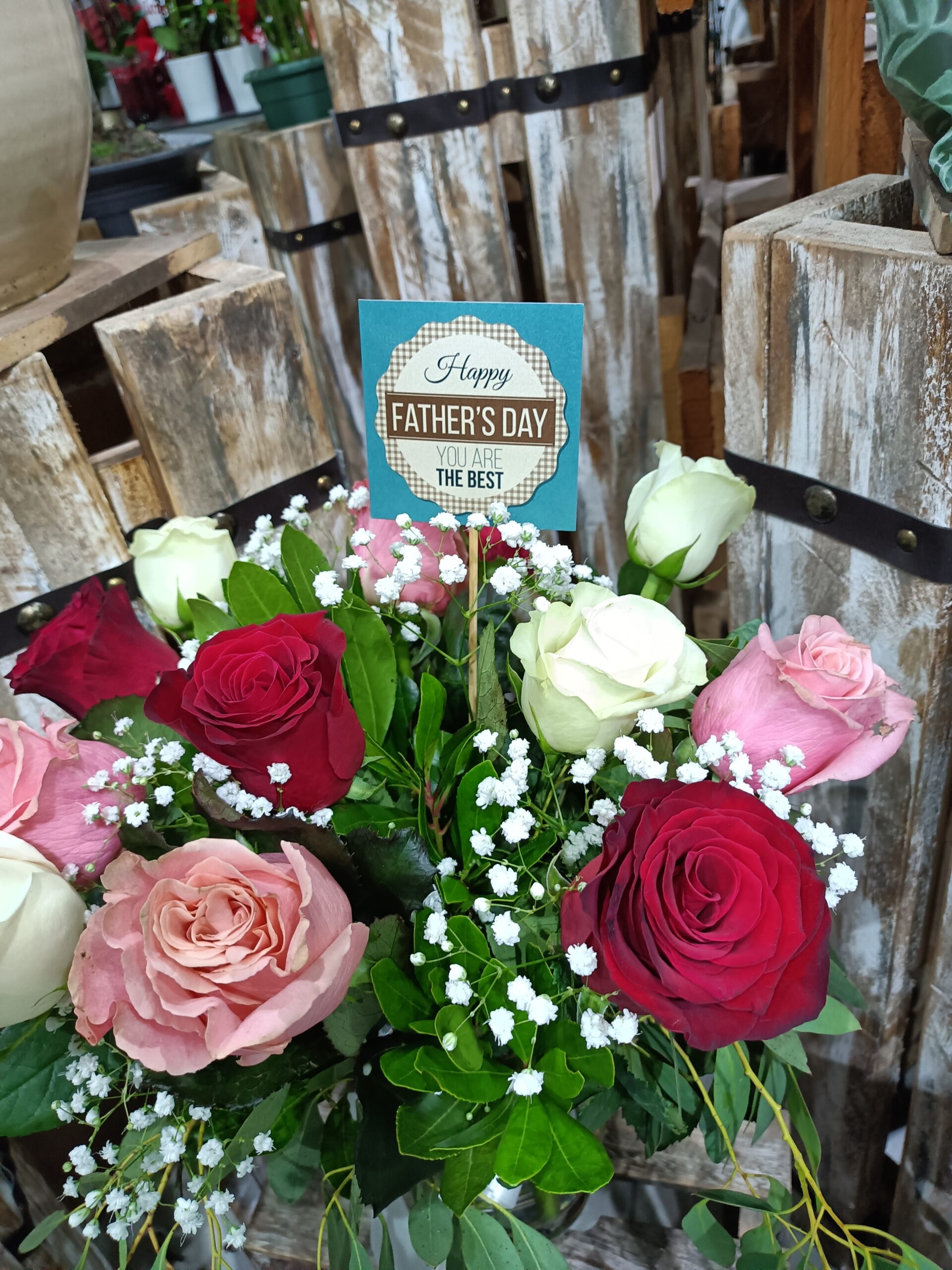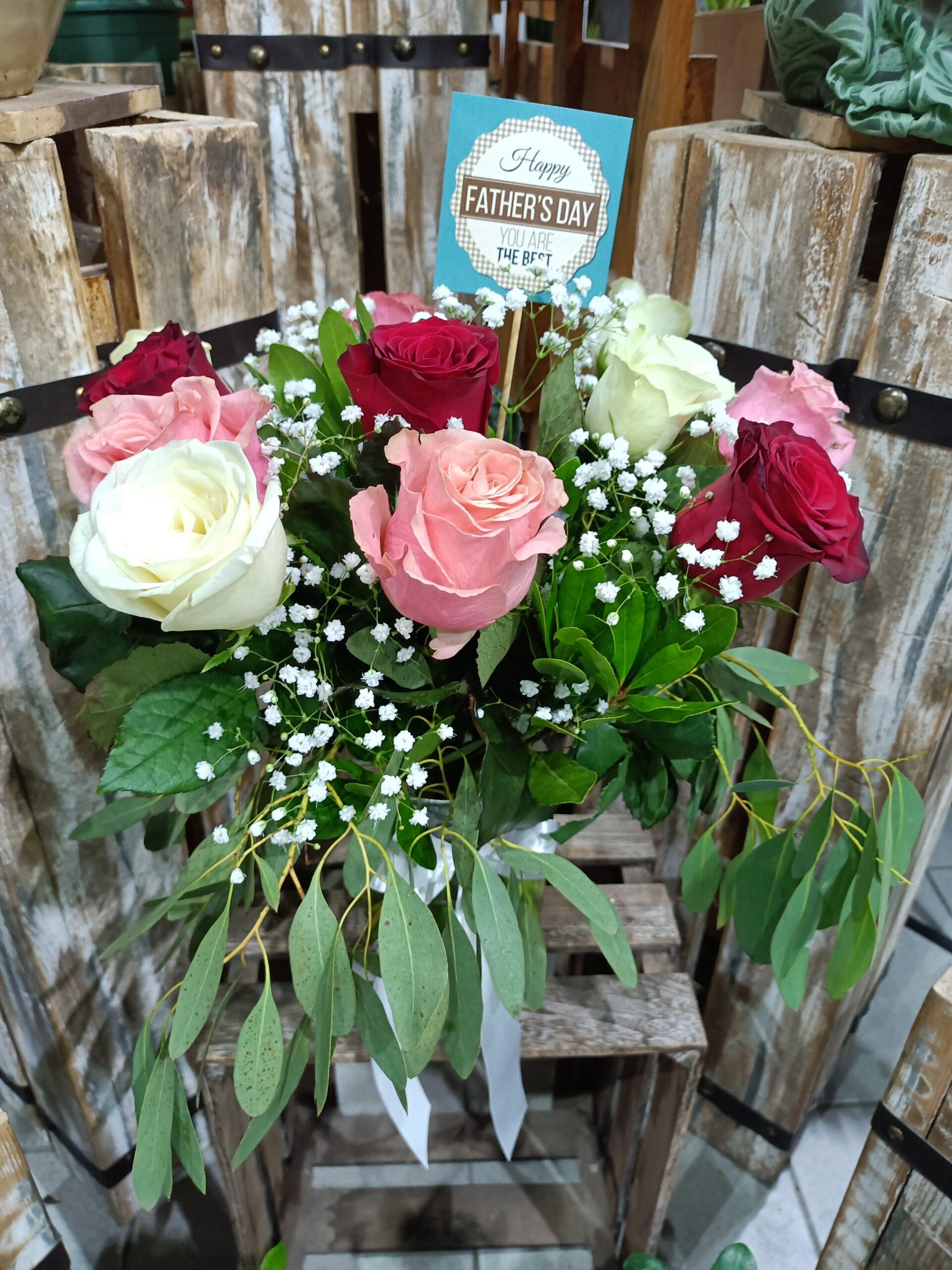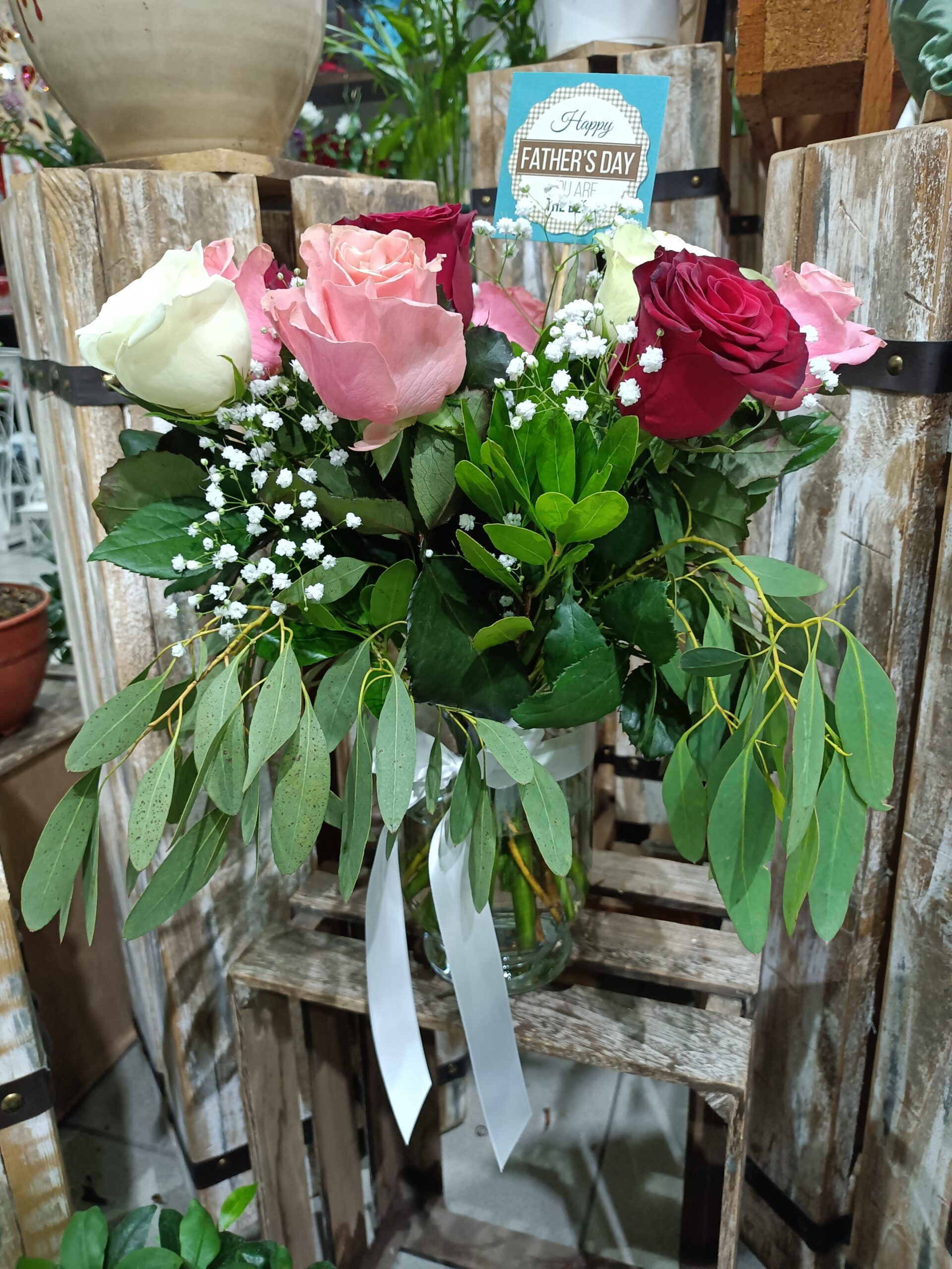 Μπουκέτο από λευκά , κόκκινα και ροζ τριαντάφυλλα σε γυάλινο βάζο!!Ύψος μπουκέτου με το βάζο 40 εκατοστά