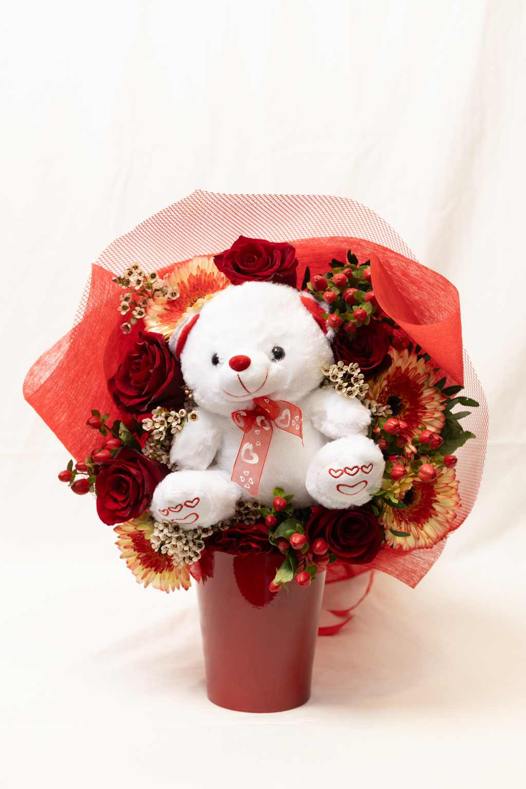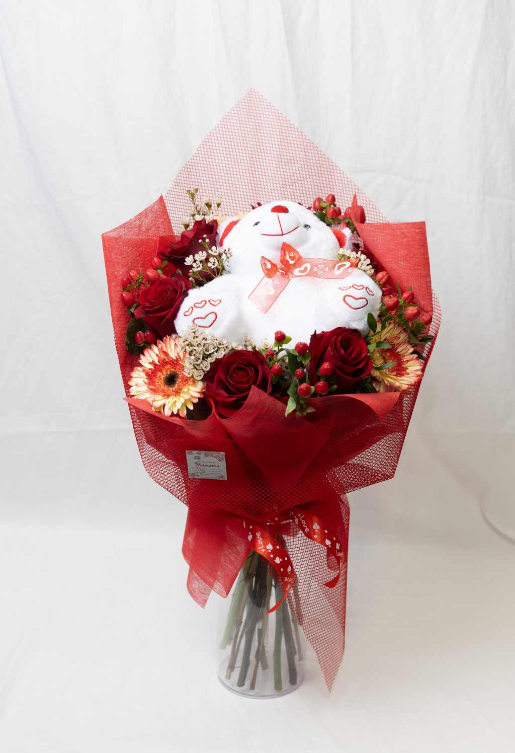 Μπουκέτο από Εκουαδόρ τριαντάφυλλα , ζέρμπερες , υπέρικουμ και βαξ συν αρκούδος!!