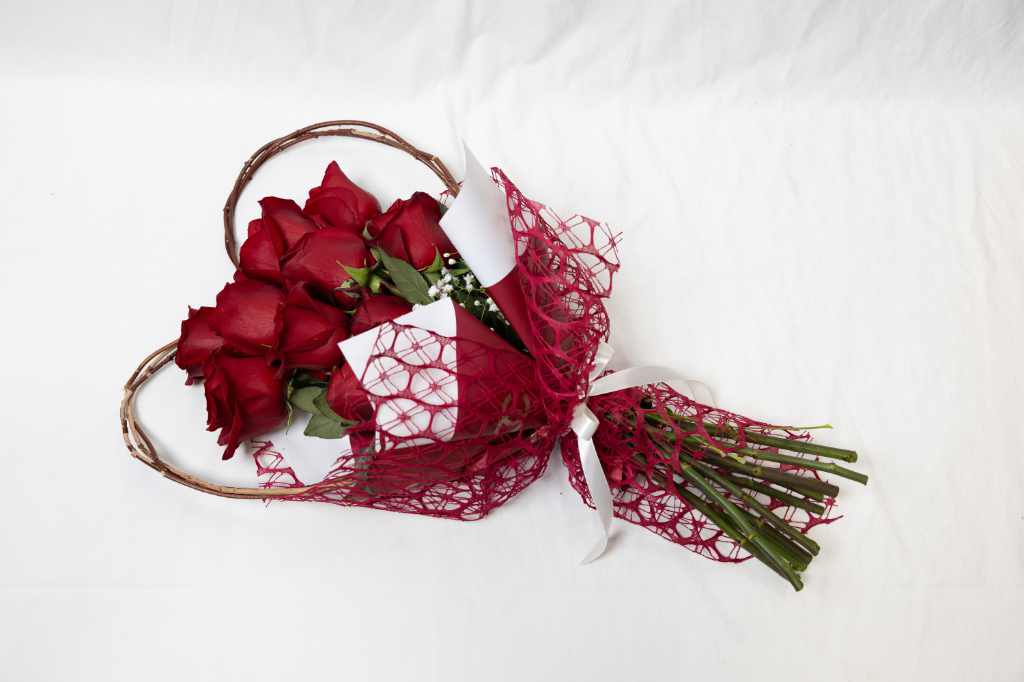 Μπουκέτο από 10 κόκκινα Εκουαδόρ τριαντάφυλλα σε ξύλινη καρδιά