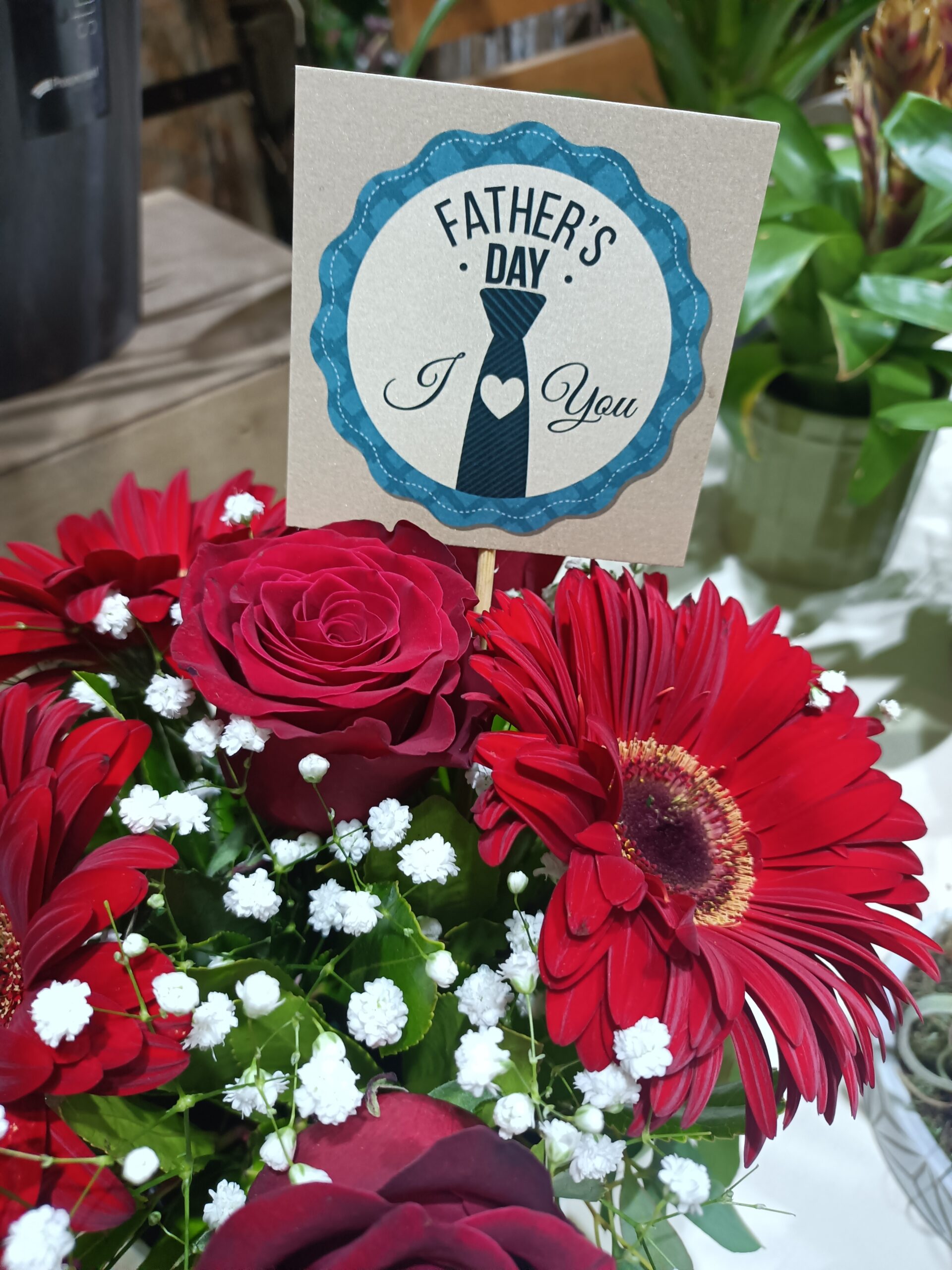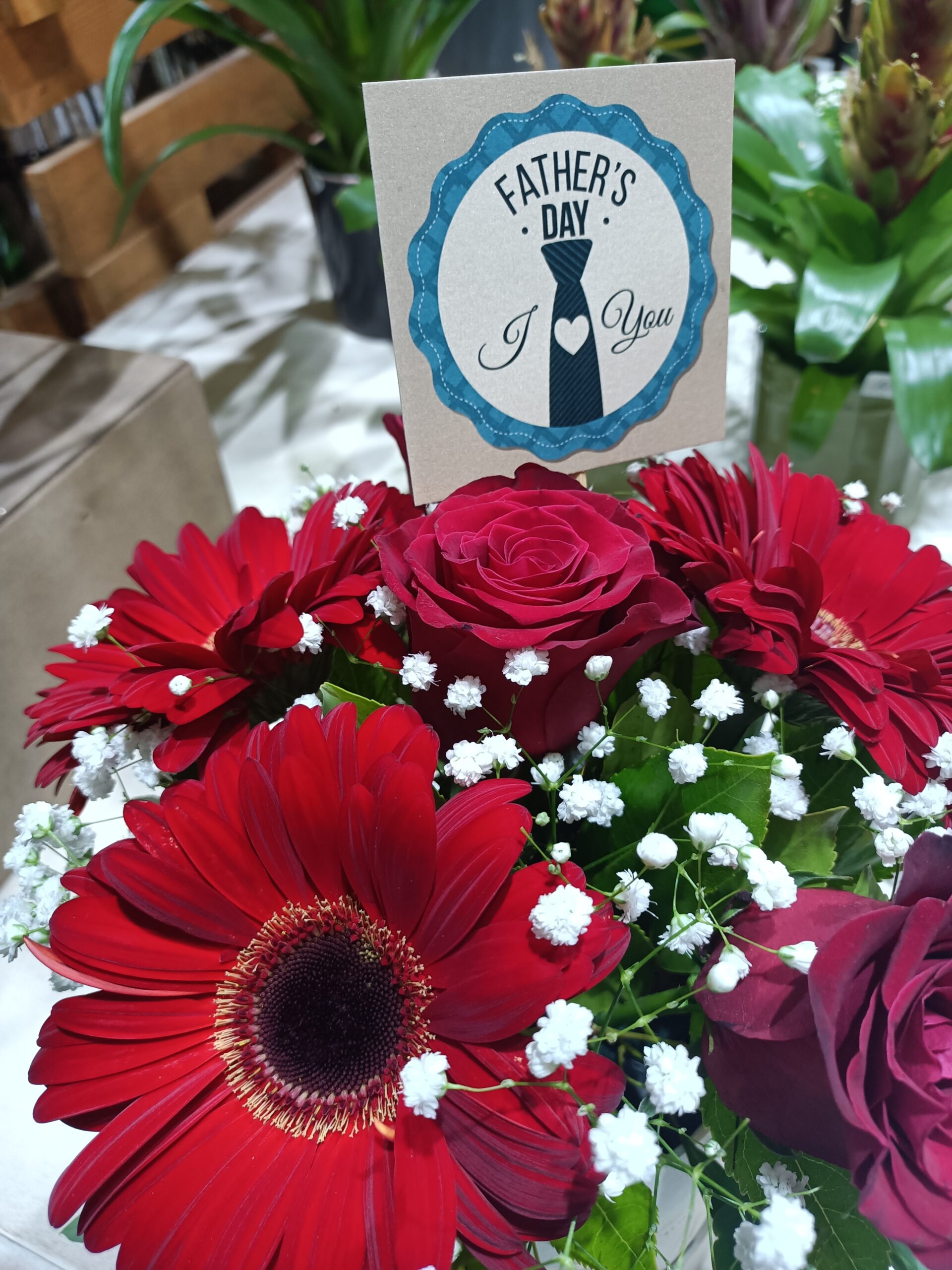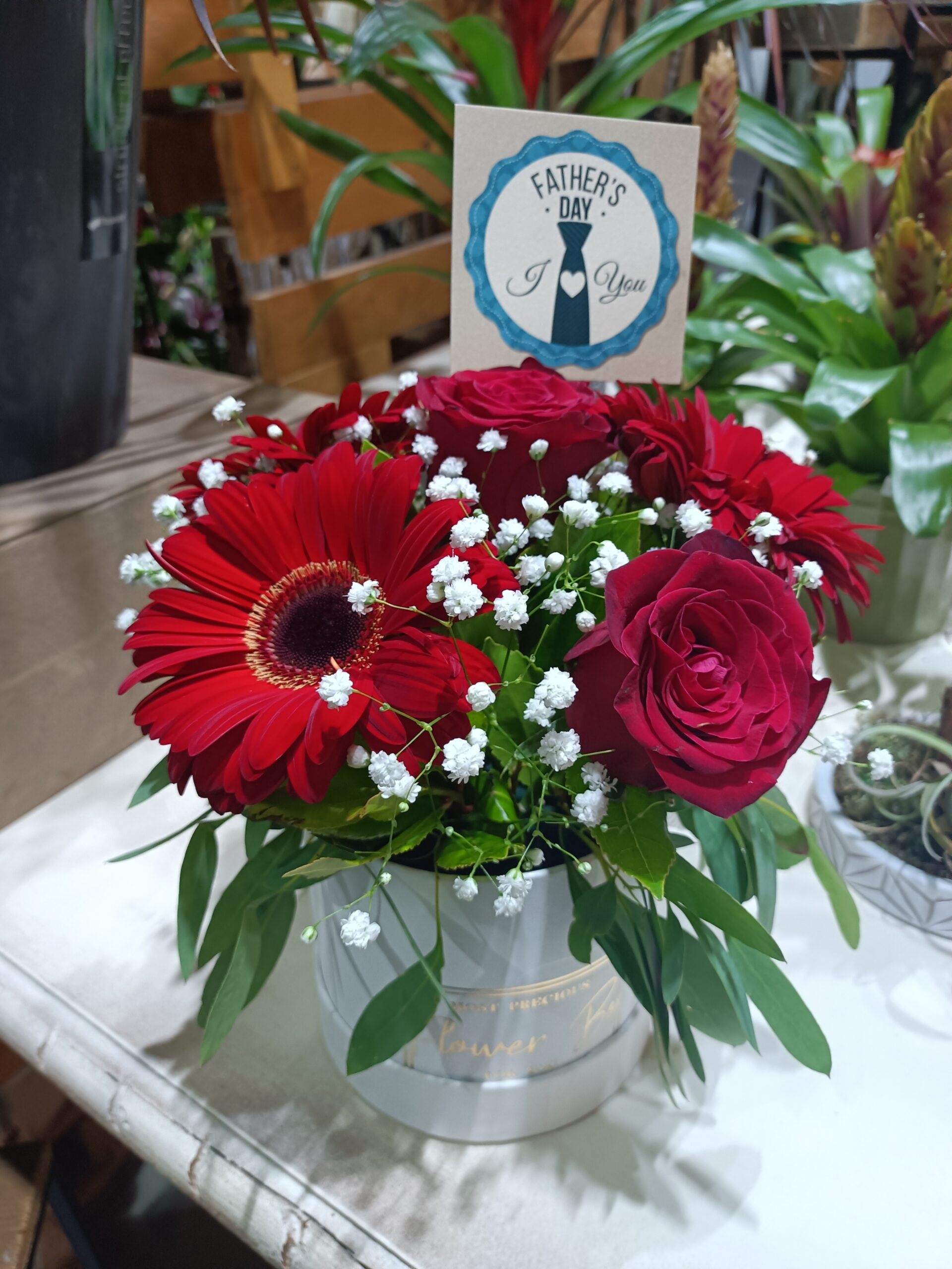 Flower box λευκό με ζέρμπερες και τριαντάφυλλα κόκκινα!!Ύψος σύνθεσης με κασπώ 25 εκατοστά (Με ξύλινο διακοσμητικό Βαλεντίνου))