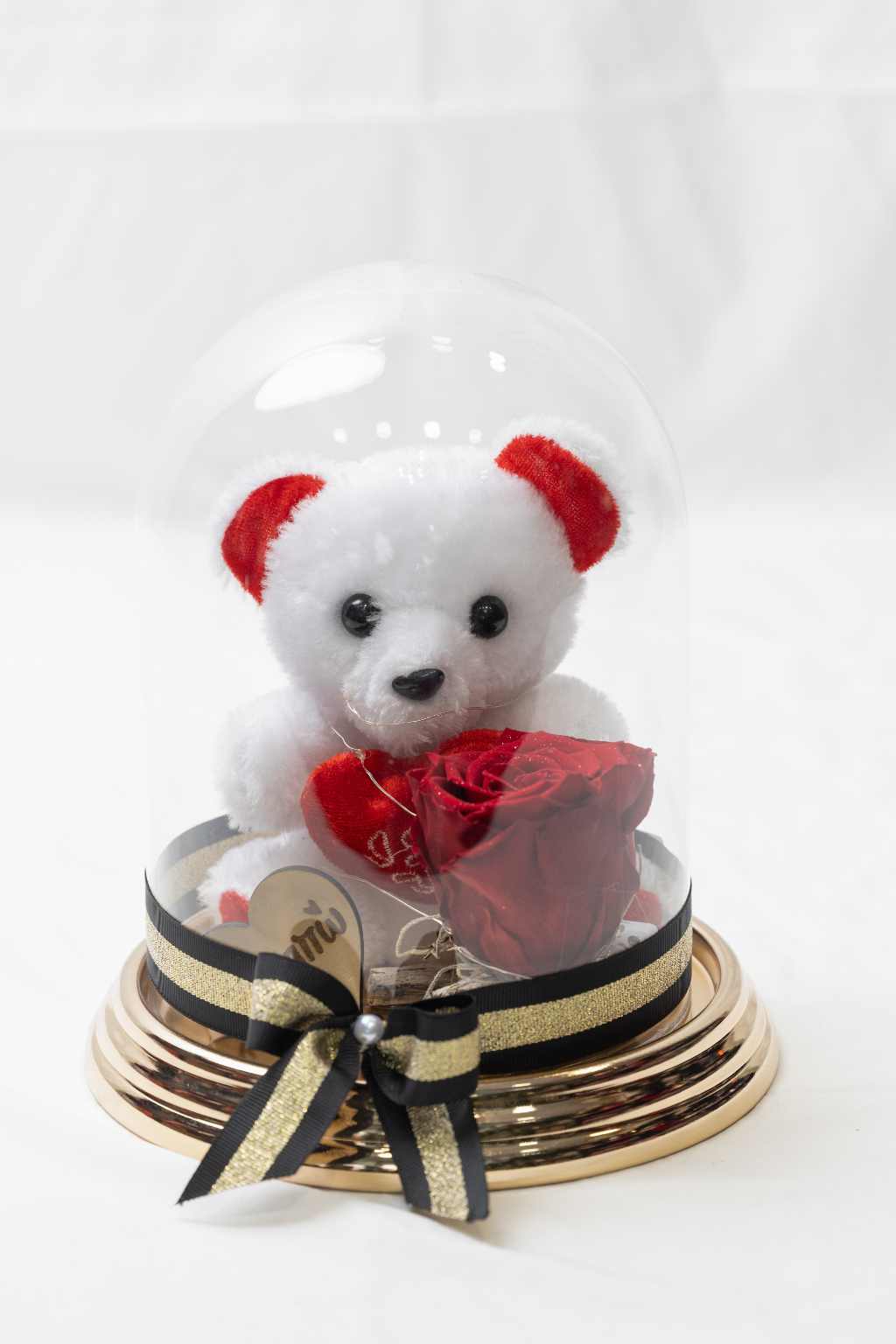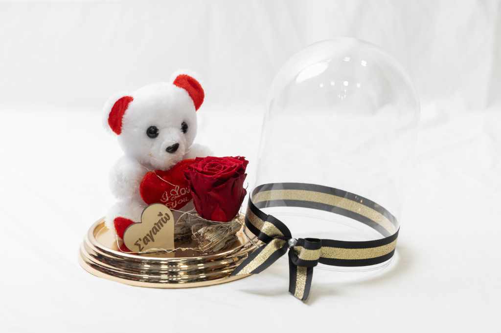 Αποχυμωμένο τριαντάφυλλο σε γυάλα καμπάνα με αρκουδάκι και led!Διαστάσεις γυάλας 20×12 cm